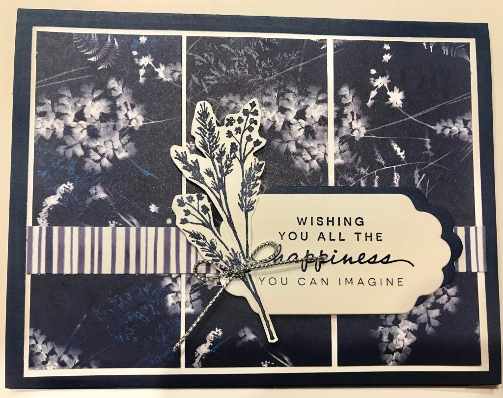 Next, I stamped the bouquet from the Nature’s Prints Stamp set in Night of Navy ink on Basic White cardstock. I cut it out with the corresponding die and adhered it next to the greeting. Finally, I embellished with a bit of silver twine!