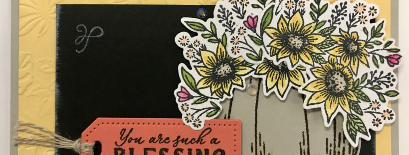I colored the sunflowers with Daffodil Delight Stampin’ Blends, the greenery with Old Olive Stampin’ Blends and the flowers with Polished Pink & Petal Pink Stampin’ Blends. I cut out the bouquets with the corresponding dies and adhered one over the other with Dimensionals.