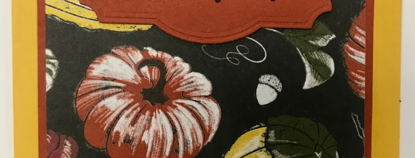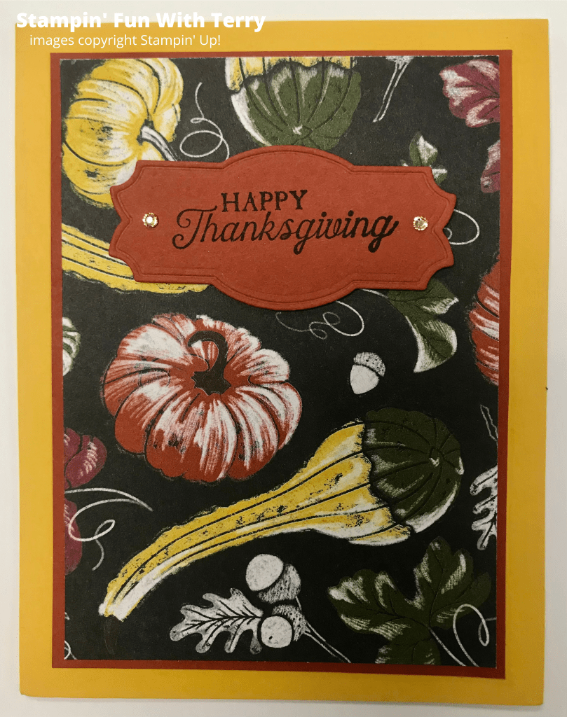 For the greeting, I stamped the “Happy Thanksgiving” greeting in black ink on a piece of Cajun Craze Cardstock. I cut out the greeting with my Natural Prints die. Then I embellished with a couple of Champagne Rhinestones.