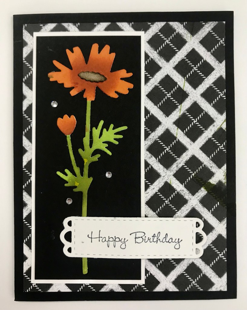 I cut the flower from a piece of Basic White Cardstock with my Meadow Die. I used Black ink for the center of the flower. I used my Sponge Dauber to color the flowers with Pumpkin Pie Ink and added Cajun Craze Ink over it. I used Old Olive & Granny Apple Green Ink for the stems.