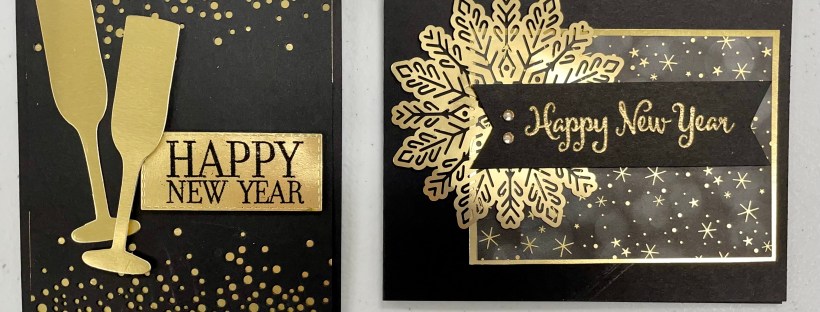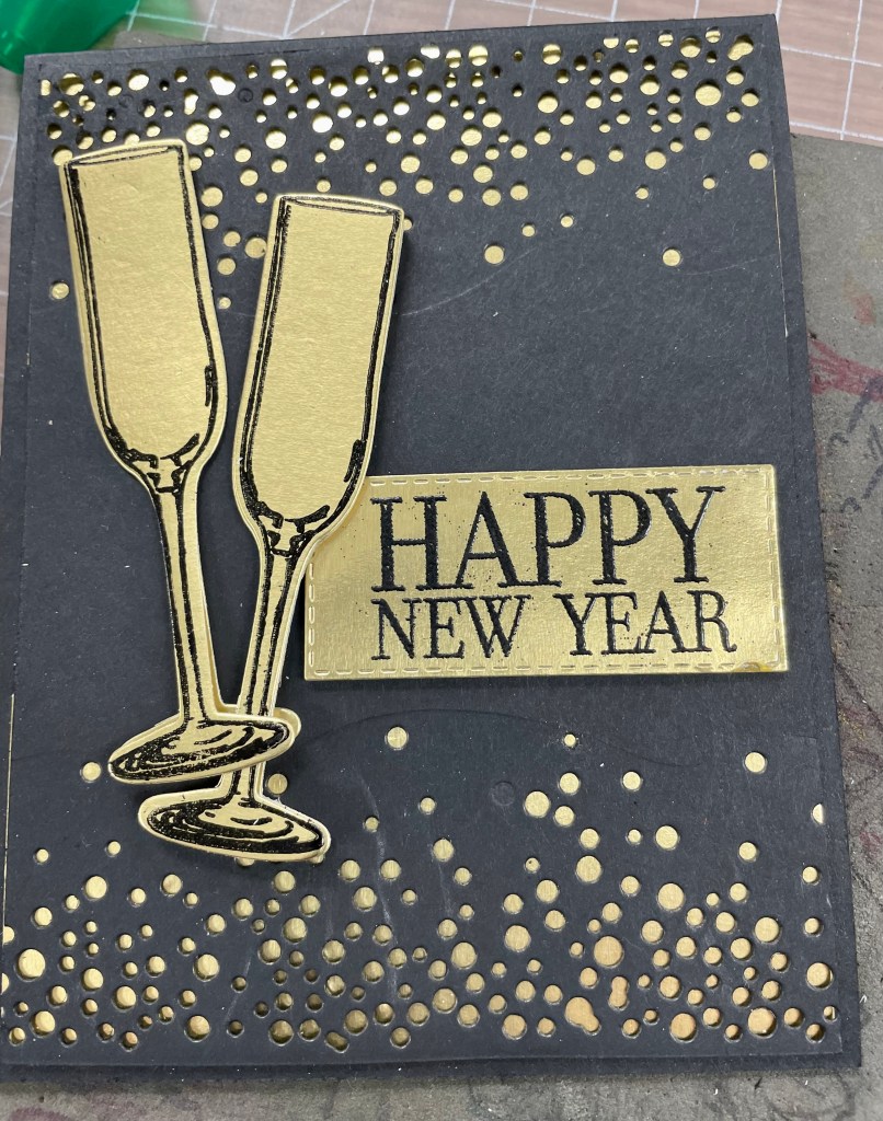 I stamped two champagne glasses in Versa Mark ink on Gold Glimmer Paper and covered with black embossing powder. I cut them out with the corresponding dies. I adhered them, with glass stems overlapping, with dimensionals.