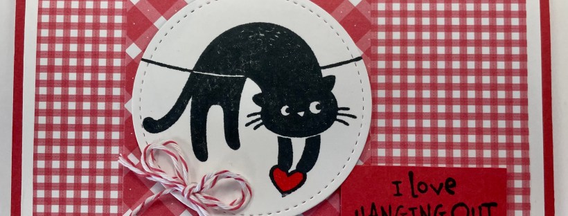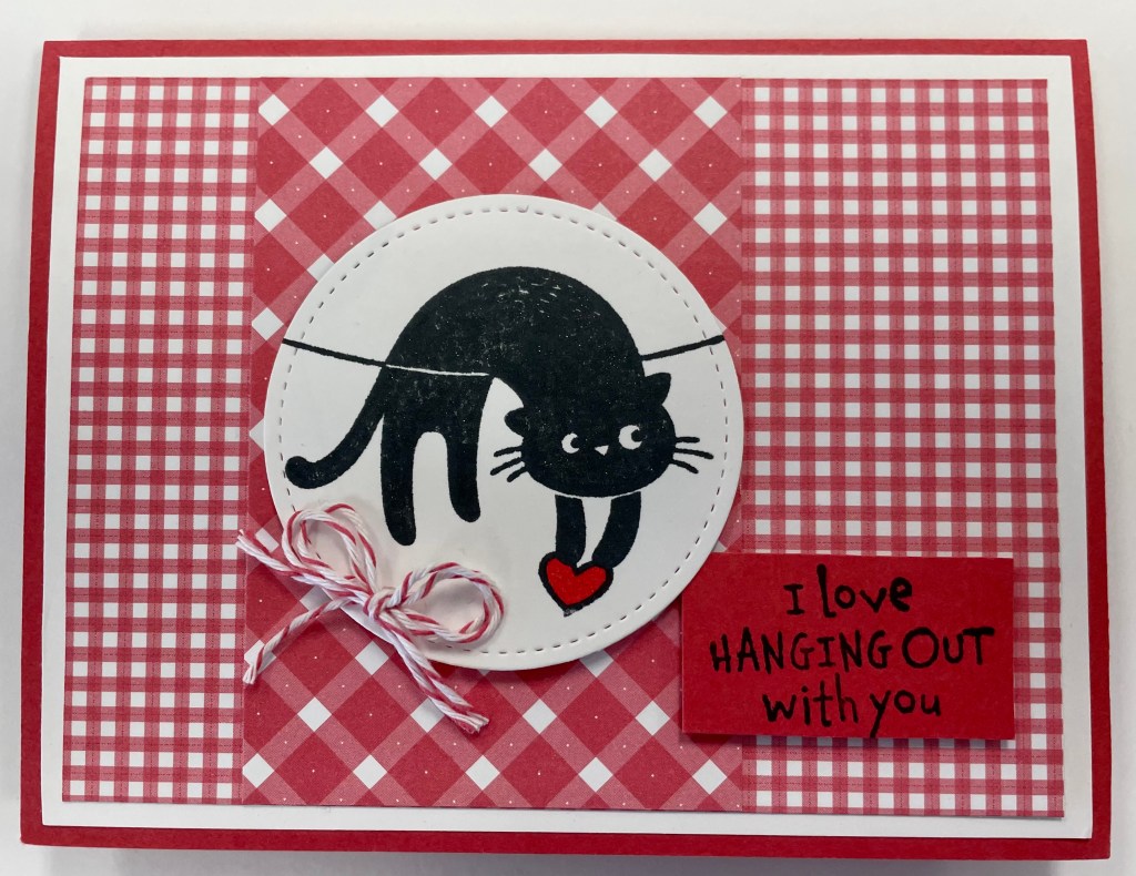 I stamped the cat in black ink on Basic White cardstock and colored the heart with a bit of Real Red ink. I cut out the image with my Layering Circles dies.