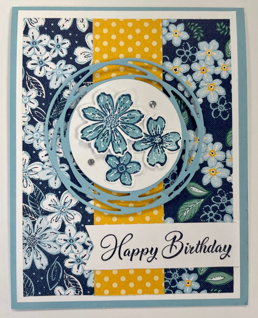 I stamped the flowers from the Petal Park Bundle in Night of Navy Ink and Balmy Blue Ink on Basic White Cardstock. I used the punch to cut out the flowers and adhere to a circle cut from Basic White Cardstock with dimensionals.