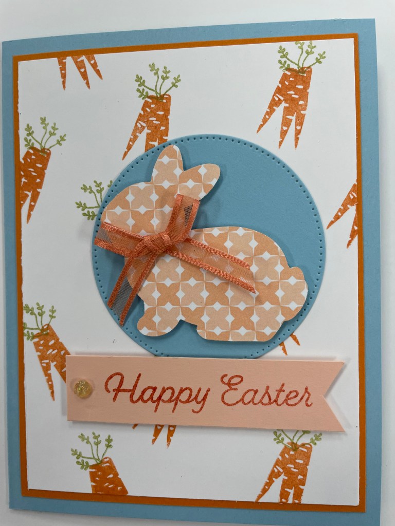 Next, I created my own designed paper with the Thanks a Bunch Stamp Set. Stamp the carrots in Pumpkin Pie & Granny Apple ink. I cut a 3.75″ x 5″ piece for the front of the card.