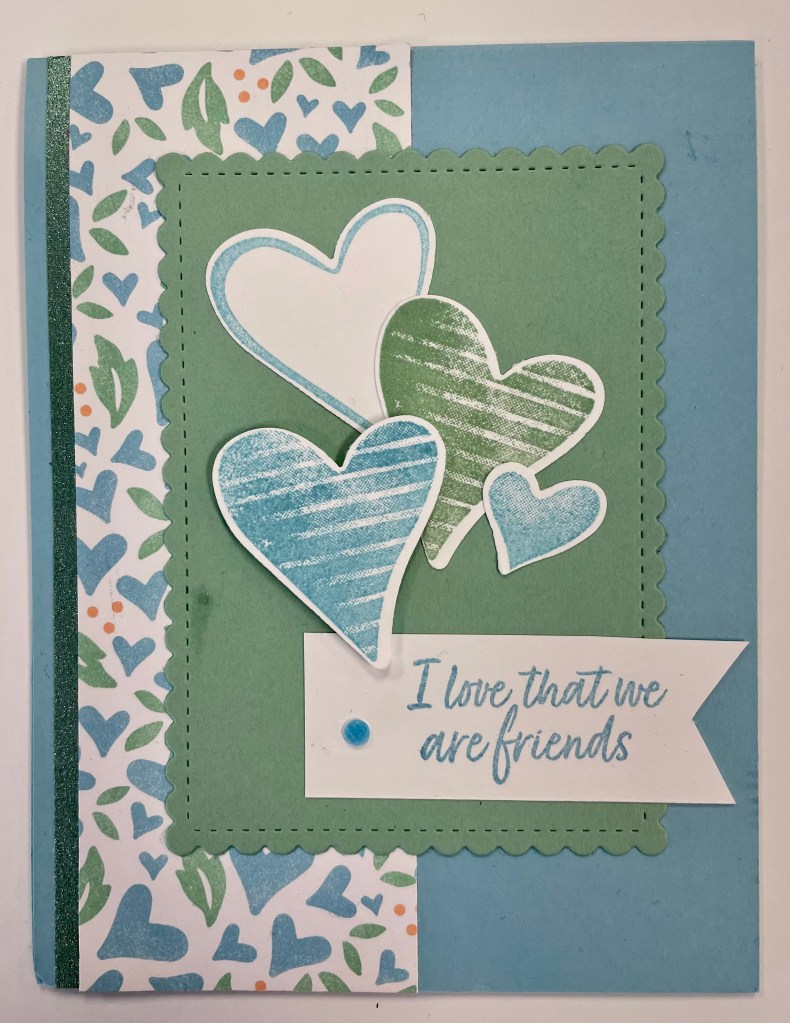 I stamped the greeting in Balmy Blue ink on Basic White cardstock. I adhered the largest heart to slightly overlap the greeting with a couple dimensionals.