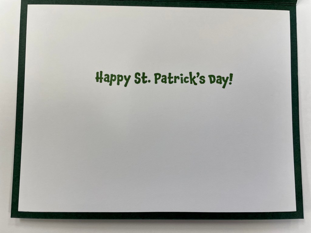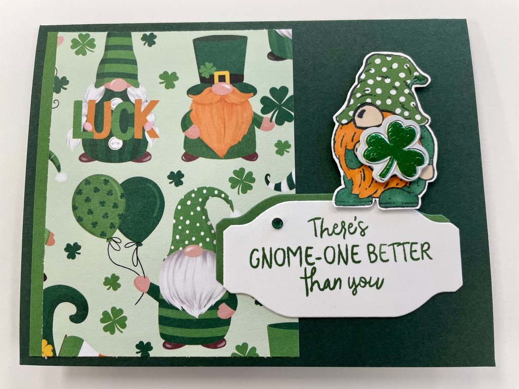 Next, I added a strip of Garden Green cardstock under a 3″ x 4″ piece of Leprechaun Gnome paper!