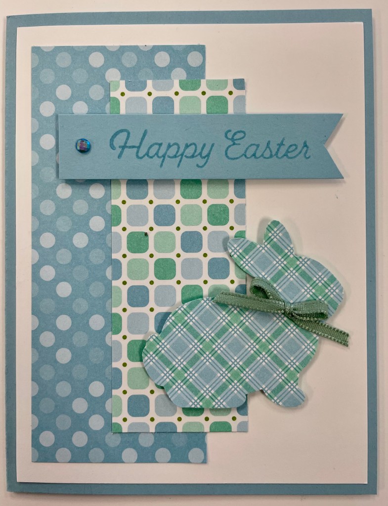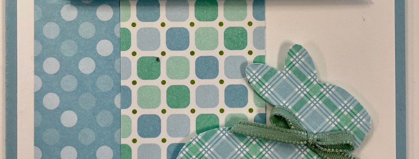 I used the bunny punch and cut out a bunny from a funky piece of DSP. I wrapped a bit of Gorgeous Grape ⅜” Sheer Ribbon around the bunny’s neck before adhering to the card with Dimensionals.