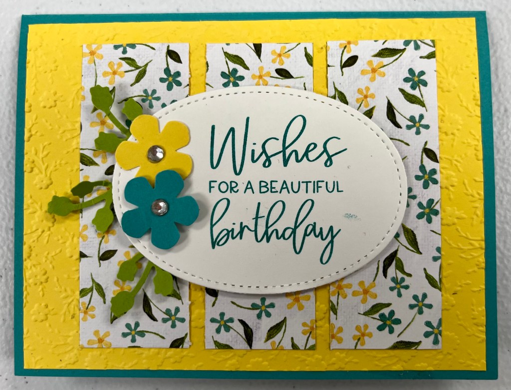 I embossed a piece of 5.25″ x 4″ Daffodil Delight Cardstock with Ornate Flowers embossing folder. Then, added 1″ strips of Hues of Happiness DSP across the front of the card.