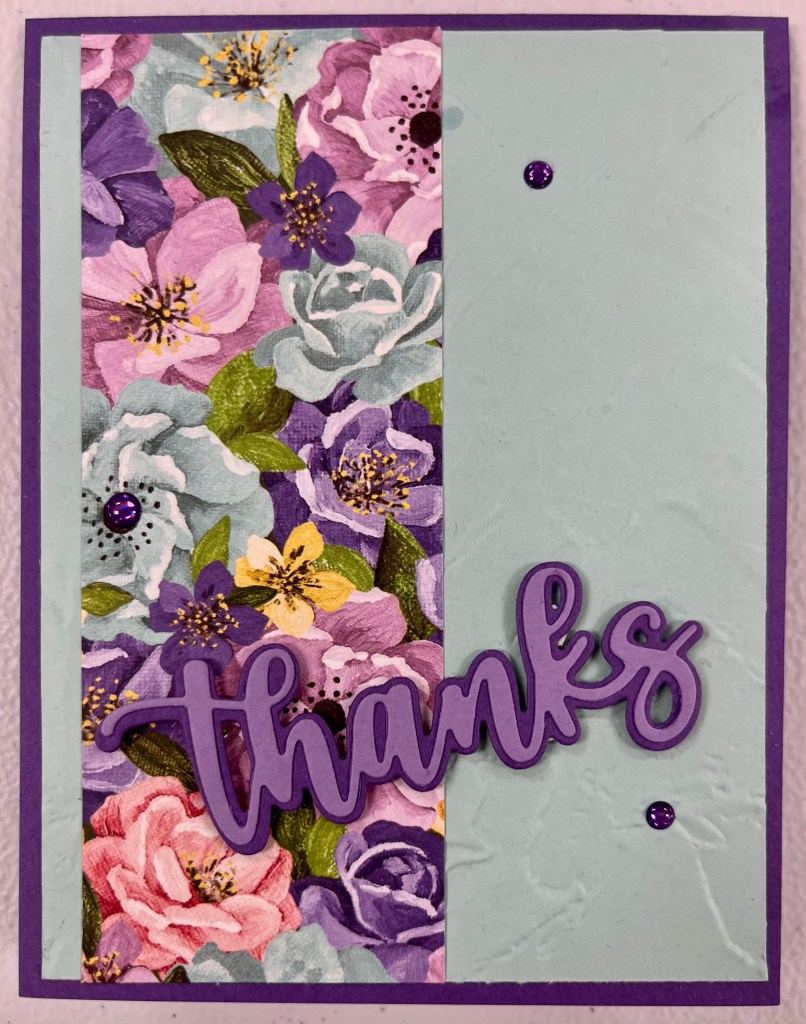 I used my Amazing Thanks Dies (retiring soon!!) to mat a piece of Highland Heather on a piece of Gorgeous Grape Cardstock.