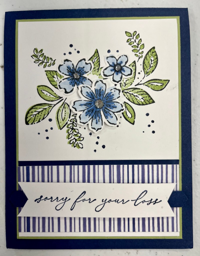 Finally, I stamped the “Sorry for your loss” greeting in Night of Navy Ink on Basic White Cardstock. I adhered it to the card over a skinny strip of Night of Navy Cardstock.