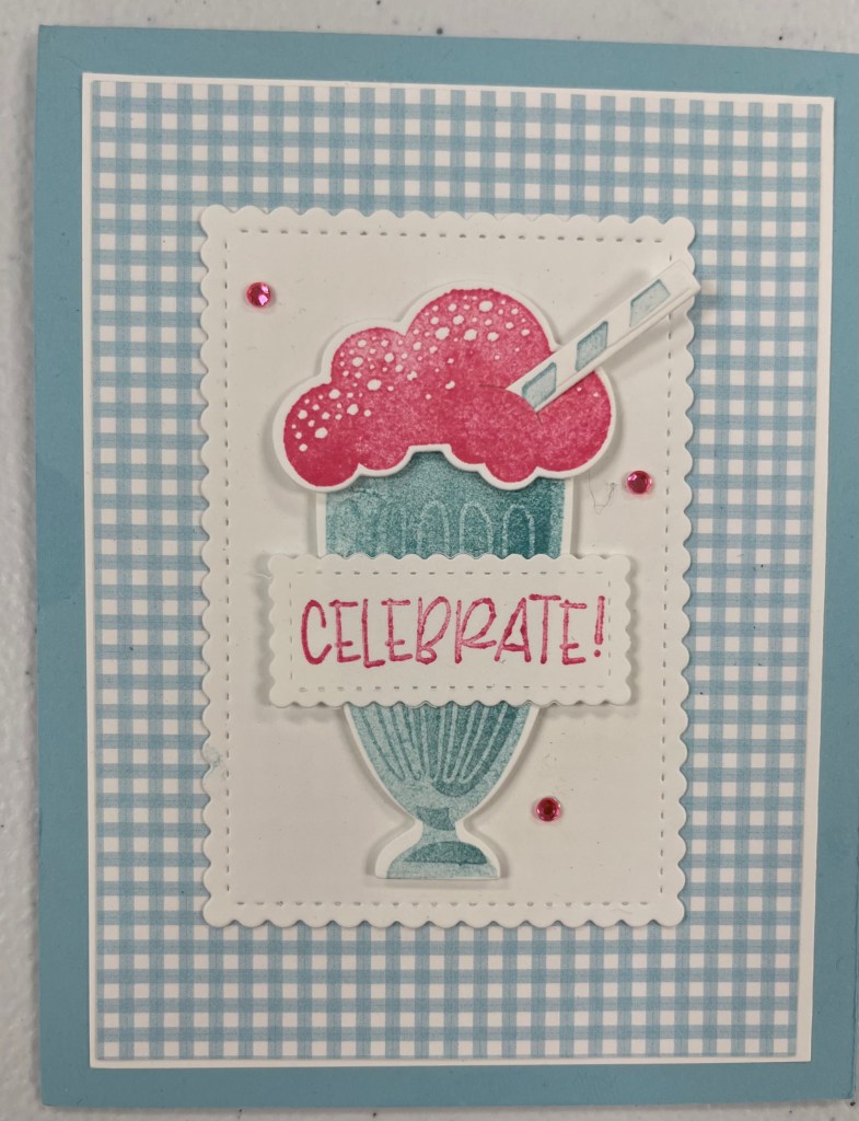 I stamped the “Celebrate!” greeting in Melon Mambo ink on Basic White cardstock and cut it out with my small Scalloped Contour die. I adhered it over the milkshake glass.