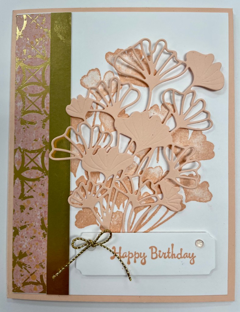 Over top the stamped image, I used my Ginkgo Branch Die to cut out the flowers from Petal Pink Cardstock.