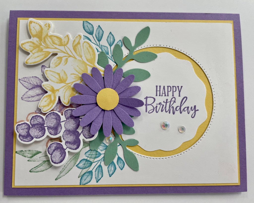 This card starts with a 5.5″ x 8.5″ piece of Highland Heather Cardstock. I used my stitched circled die to cut a circle out of a piece of 5.25″ x 4″ Basic White Cardstock. Then, I matted the piece of white cardstock to a piece of Daffodil Delight Cardstock.