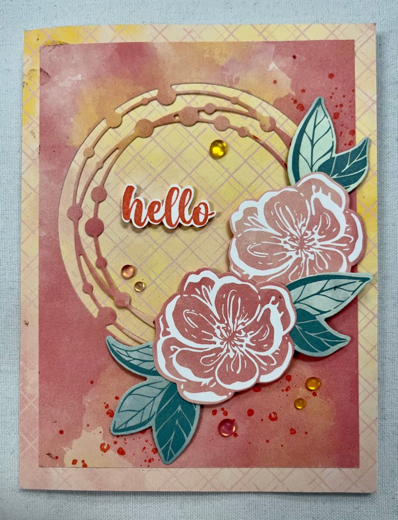 I stamped the “hello” greeting in Sweet Sorbet on Basic White Cardstock before adhering to the center of the die-cut circle on the card.