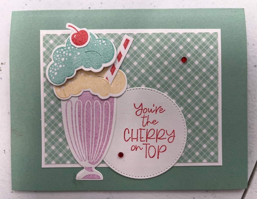 I stamped the milkshake glass from the Share a Milkshake Stamp Set in Fresh Freesia Ink. I adhered it slightly over the greeting. I stamped the ice creams in Pale Papaya and Lost Lagoon Ink. Next, I stamped the cherry and straw in Cherry Cobbler Ink on a piece of Basic White Cardstock. I adhered the top ice cream with dimensionals.