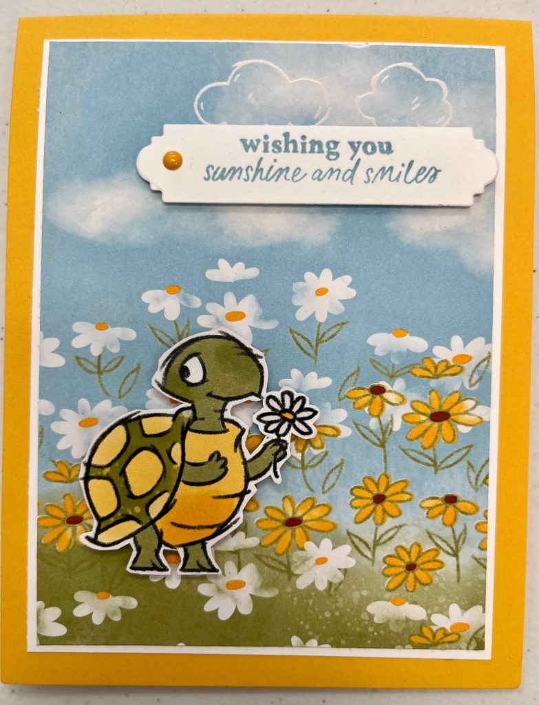 I used the Playing in the Rain Dies to cut out the turtle from the Rain or Shine Specialty DSP and adhered it to the card with dimensionals.