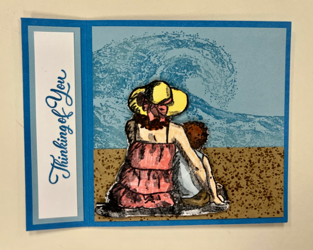 I stamped the wave from Waves of Inspiration Stamp Set in Balmy Blue ink on Balmy Blue Cardstock. For the sand, I used the stamp from the Places in the Heart Stamp Set in Crumb Cake ink on Crumb Cake Cardstock. I adhered the strip of Crumb Cake cardstock to the card.