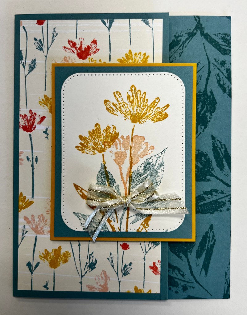 On a piece of Very Vanilla Cardstock, i stamped the flowers from the Inked Botanicals Suite in Petal Pink and Crushed Curry. I stamped the foliage in Lost Lagoon ink. I cut out the design with the rectangle from the Nested Essentials Dies and adhered it to a 3″ x 2-3/8″ piece of Lost Lagoon Cardstock. I adhered that to a piece of 2.5″ x 3-1/8″ Crushed Curry Cardstock. I adhered this to the front of the card and embellished with ribbon from the Inked Botanicals Suite.