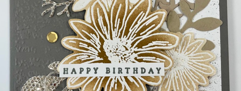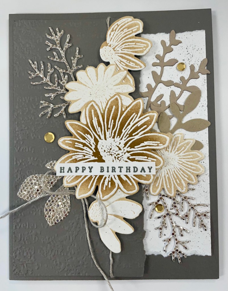 Finally, I adhered the rest of the foliage and daisies to the embossed piece of Pebbled Path cardstock. I stamped the “Happy Birthday” greeting in Pebbled Path ink on Basic White Cardstock. I cut the greeting very thin before adhering to the card.