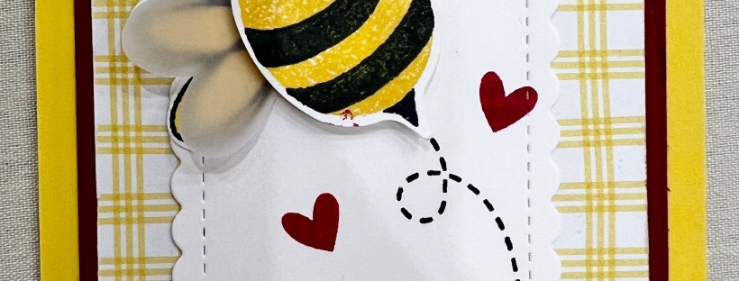 This card starts with a 4.25″ x 11 piece of Daffodil Deligh Cardstock. Adhere a 3.75″ x 4.75″ piece of Real Red Cardstock to the front of the card and matt a piece of DSP from the Bee Mine Suite Collection in the middle.