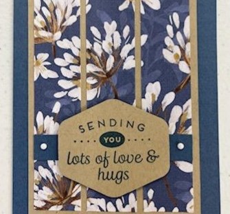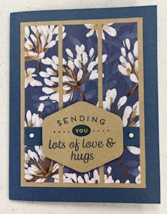 Today I have a simple card that focuses on the beautiful Wildly Flowering DSP. I began with a card base of Misty Moonlight cardstock, cut to 8-1/2″ x 5-1/2″, scored and folded at 4-1/4″. For the matte layer, I used Crumb Cake cardstock, cut to 4-3/4″ x 3-1/2″. With a 3″ x 4-1/2″ piece of the Wildly Flowering DSP, I cut it into three equal 1″ pieces, longwise. A note before cutting the DSP: if the image is directional, make sure you are cutting so the image is in the correct position. Glue the strips using your preferred adhesive (Multipurpose liquid glue or Stampin’ Seal) onto the Crumb Cake cardstock, leaving a 1/8″ border and between strips. Position the strips so the image is continuous. Adhere this to the card base with equal borders. With the Heartfeld Hexagon stamp set, stamp the sentiment on a scrap of Crumb Cake cardstock with Misty Moonlight ink. Punch the sentiment out with the Heartfelt Hexagon punch. Glue a 3-1/4″ x 1/2″ strip of Misty Moonlight cardstock about an inch or so from the bottom of the matte piece. Adhere the sentiment with Dimensionals over the strip. On either side of the sentiment, add an iridescent pearl basic jewel.