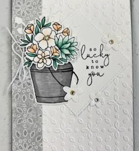 Now you have all the bits and pieces to assemble the card. Glue the square about 1/2″ from the top of the card with the corner pointing up. Glue the bucket to the left side of the square. Add Dimensionals to the back of the flowers. Before removing the backing, place the arrangement where you want it to go. Add glue to the buds and slide them under the image and adhere where you want them to go. When you are happy with them, peel the backings off the Dimensionals and adhere the flowers to the card. Add the white die cut flowers with a dab of glue or a Mini Glue Dot. Add a rhinestone to the center of each flower. Secure the bow to the left of the focal image using a MIni Glue Dot.