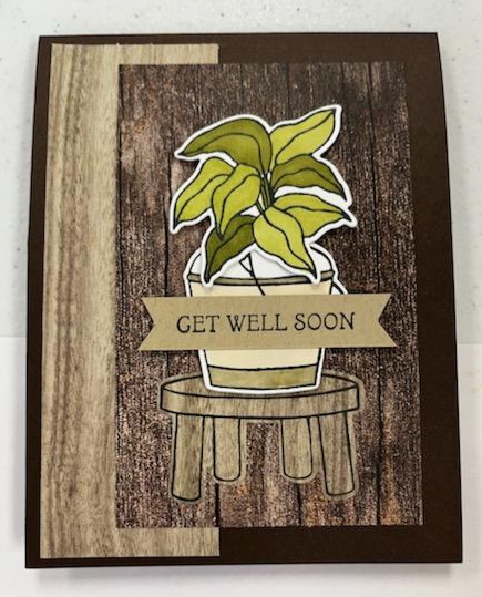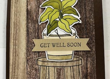 I glued the stool image towards the bottom of the darker grained piece. I glued the bucket image on the stool and adhered the leaf image using Dimensionals for a bit of dimension. Lastly, I adhered the sentiment with Dimensionals on the bucket image. To finish the card, I glued a 5-1/4″ x 4″ piece of Basic White cardstock inside the card after stamping a sentiment.