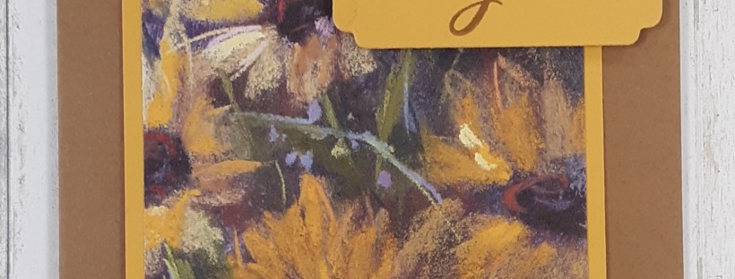 I started by cutting a card base from Pecan Pie cardstock to 5-1/2″ x 8-1/2″ with my Paper Trimmer, scoring and folding at 4-1/4″, crisping the fold with my Bone Folder. Just the name of the cardstock puts me in mind of Thanksgiving! Who doesn’t love a slice of pecan pie? I cut a piece of Crushed Curry cardstock to 3-1/4″ x 5-1/2″. I cut the flowered image from Splendid Autumn 6″ x 6″ DSP to 3″ x 5-1/2″ and adhered it to the Crushed Curry piece leaving a 1/8″ border on either side. I cut a length of ribbon about 10″. The picture shows a piece of Crushed Curry colored ribbon, but a good substitute is Wild Wheat 3/8″ Rustic Striped ribbon. You could also use a piece of the white ribbon in the Petal Pink & White 1/4″ Diagonal Trim Combo Pack and use a Dark Daffodil Delight Stampin’ Blend Marker to color it. I tied the ribbon with a simple knot about an inch from the bottom. I adhered this to my card base, centering it using my favorite adhesive, Multipurpose Liquid Glue or Stampin’ Seal.