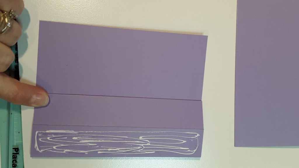 I really worked the folds on the smaller piece, folding back and forth and burnishing to make the folds more pliant. I folded in the 1-1/2″ fold and applied glue to the 1/2″ strip. I used Multipurpose Liquid Glue, or you could use Stampin’ Seal.