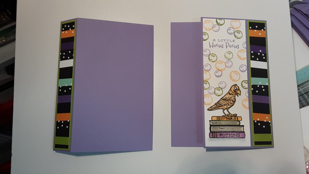 It is easier to decorate the two pieces before sticking them together, so we’ll work on that next. With Granny Apple Green cardstock, I cut 2 strips to 5-3/8″ x 7/8″ to be a matte. With the striped piece from the Halloween Spells DSP, I cut 2 strips to 3/4″ x 5-1/4″. I adhered the DSP strips to the Granny Apple Green strips with very narrow (1/16″) borders. From the Granny Apple Green bubble paper in the same pack of DSP, I cut a 1-1/2″ x 5-1/4″ strip. From Basic White cardstock, cut a piece 3″ x 5-1/4″ and another at 1-7/8″ x 5-1/4″. We’ll stamp on these. On the 3″ strip, I stamped the sentiment “Double, Double Toil and Trouble, Happy Halloween” from the Potions and Spells stamp and die bundle in Momento Tuxedo Black ink. On the 1-1/2″ strip, I stamped the bird image about 1-1/4″ in from the bottom in Momento Tuxedo Black ink. I stamped the bird on a piece of masking paper and cut out the feet and placed the mask on the bird. Then I stamped the pile of books with Tuxedo Black ink, looking through the photopolymer stamp so the bird is standing on the books. After stamping, I removed the mask. In Highland Heather ink, I stamped the sentiment “A Little Hocus Pocus.” I stamped the bubbles from Potions and Spells using Peach Pie ink for the largest bubbles, Granny Apple Green ink (stamped off once before stamping) for the medium bubbles, and Highland Heather ink for the smallest bubbles. I colored in the bird with Daffodil Delight Stampin’ Blends and SU800 and SU500 Stampin’ Blends. For the books, I used Peach Pie, Granny Apple Green, Ivory, Fresh Freesia, Daffodil Delight, and Basic Black Stampin’ Blends.