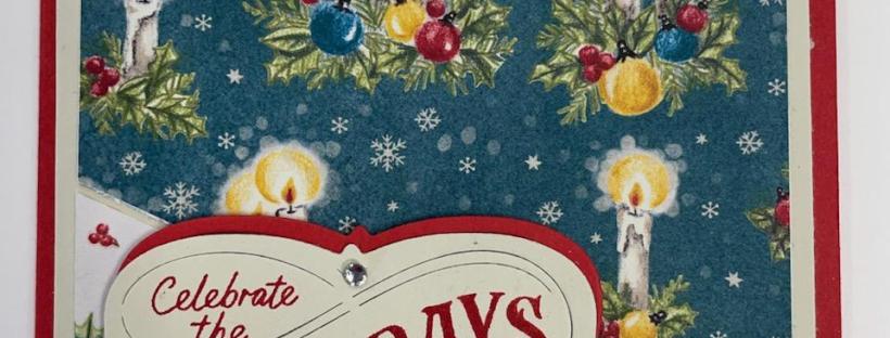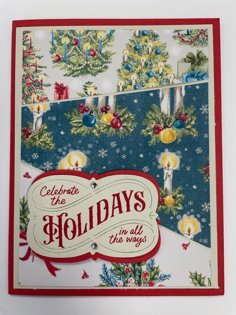 For the sentiment, I stamped the “Celebrate the Holidays in all ways” greeting from the Christmas Labels stamp and die bundle on a piece of Basic Beige cardstock with Real Red ink. I cut it out with the coordinating label die on my Stampin’ Cut & Emboss Machine. I cut another label from Real Red cardstock. I cut the Real Red label in half horizontally and glued my Basic Beige piece on top of it, offset top and bottom, leaving a red edge peeking out. I adhered two Basic Rhinestones to the greeting and adhered it to my card using Stampin’ Dimensionals.