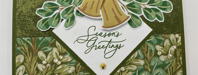 To begin, I cut a card base of Mossy Meadow cardstock to 5-1/2″ x 8-1/2″ with my Paper Trimmer, scored and folded at 4/-1/4″, and burnished with my Bone Folder. I cut 2 2″ x 5-1/4″ strips from the Season of Gold and Green Specialty DSP as shown in the photo above. I adhered these strips using my favorite adhesive (Multipurpose Liquid Glue or Stampin’ Seal). From the Season of Gold and Green Specialty DSP, I fussy cut the bells and two sprigs of the foliage using my Paper Snips.