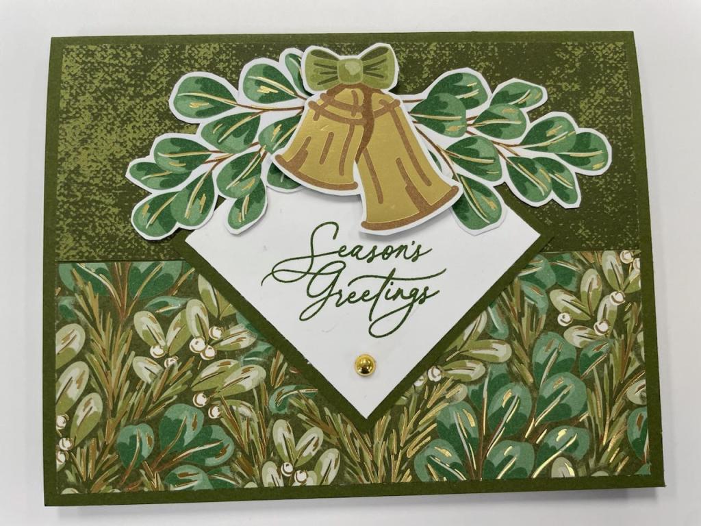 I cut a scrap of Mossy Meadow cardstock to 2-1/2″ x 2-1/2″ square. I cut a scrap of Very Vanilla cardstock to 2-1/4″ x 2-1/4″ square. With Mossy Meadow ink, I stamped “Season’s Greetings” from the Greetings of the Season stamp set in the bottom half of the Very Vanilla square. I made sure the corners were pointing up and down before stamping. I glued my stamped piece to the Mossy Meadow matte piece. I glued this to the middle of my card and a little above the center line. I adhered the foliage sprigs to the back of the bells and adhered the image to the top of my square using Stampin’ Dimensionals.