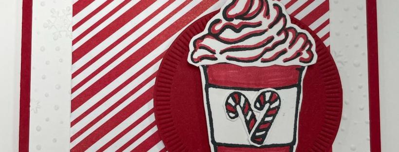I adhered my cup with the whipped cream to the center of my red circle die cut. The whipped cream extends slightly above the top of the circle. I glued the two candy canes to the white label of the cup. I adhered the circle to my card with Stampin’ Dimensionals to the lower right, about 3/4″ from the bottom edge of the DSP and extending slightly past the right edge.