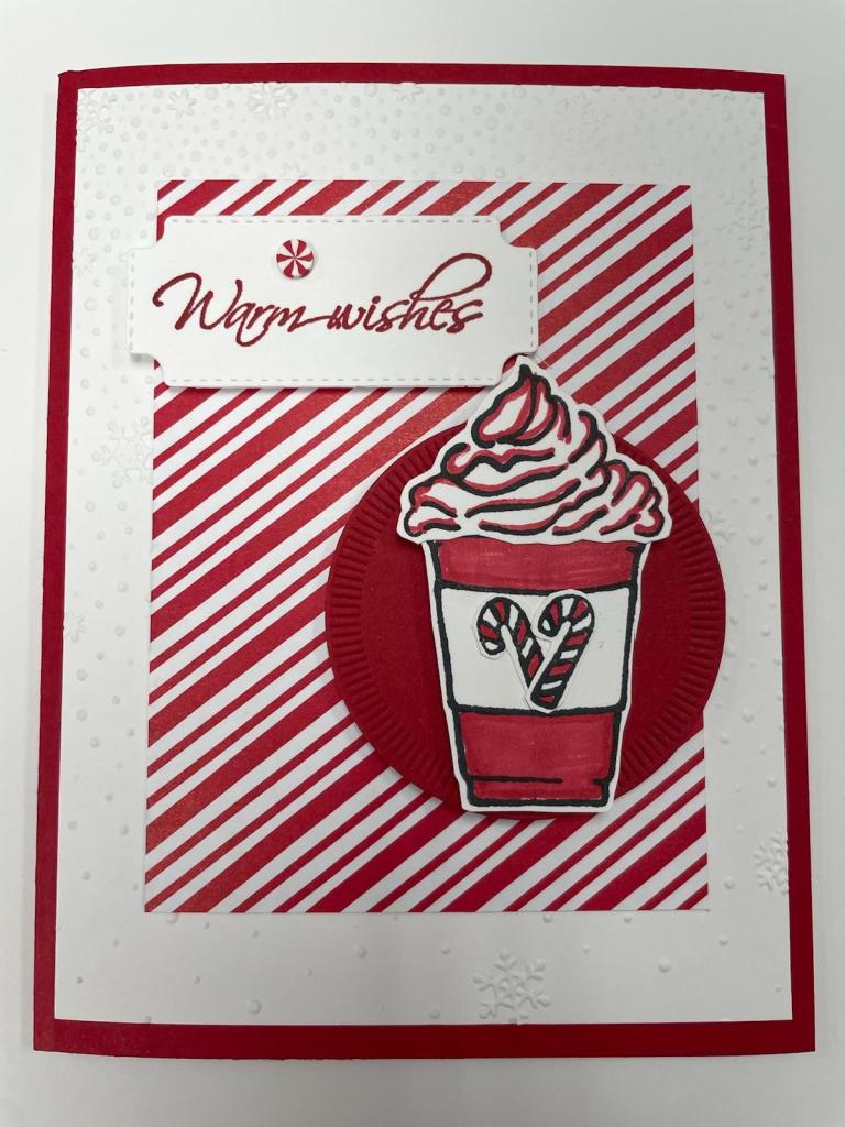 When we think of winter and Christmas celebrations, we often think of cozy fires in the fireplace and a cup of hot cocoa with the added peppermint candy cane. This simple card will warm your recipient’s heart and provoke warm memories!