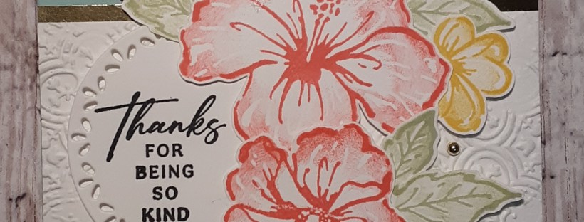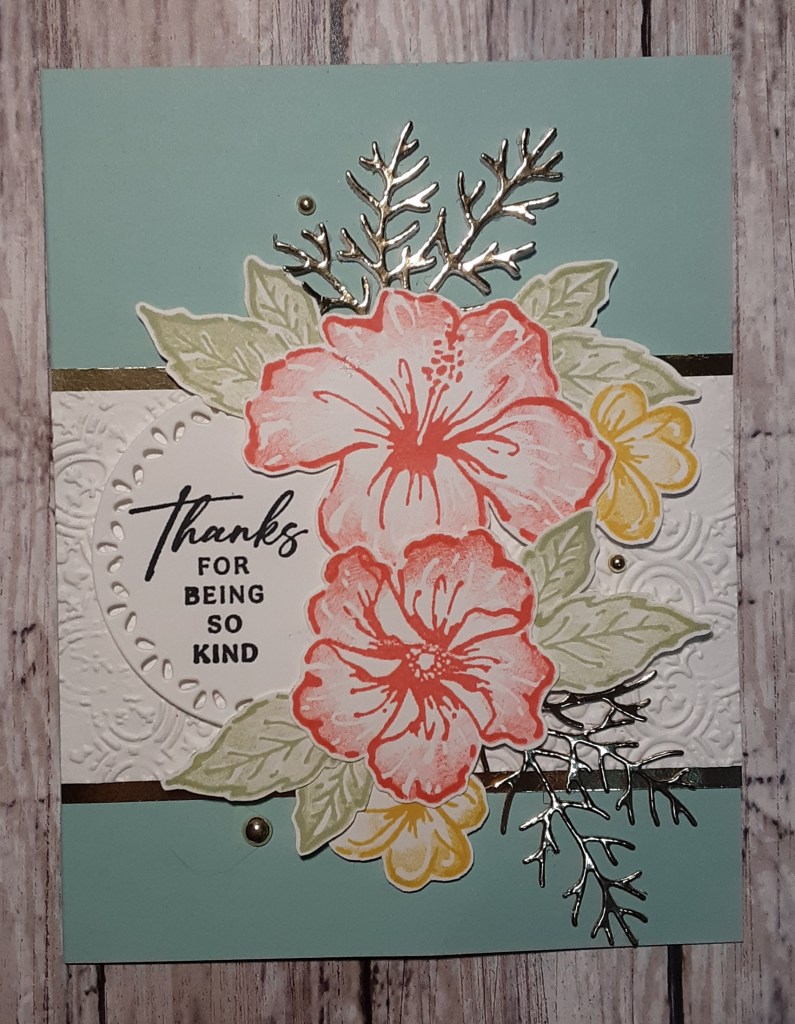 With a scrap of Basic White cardstock, I die cut a circle from the Spotlight on Nature dies and stamped the Thanks sentiment from the Happy Hibiscus stamp set with Momento Tuxedo Black ink on the left side of the circle. I stamped the outline hibiscus image (the three flowers are on the same stamp for more efficient die cutting) with Flirty Flamingo ink. With a Sponge Dauber, I applied Flirty Flamingo ink to the solid flower images, but just along the edges, and stamped onto the outline images. This gave the flowers a softer look and I only needed one ink pad! I stamped the leaf images with Soft Sea Foam ink, sponge daubed the solid part and stamped. I used Daffodil Delight ink for the smaller flower images. I didn’t have the dies, so I fussy cut all my images out with my Paper Snips. I recommend using the dies. You can also add dimension to the flowers by running them through the coordinating embossing folder, which I didn’t have on hand. Get the bundle here for 10% off.