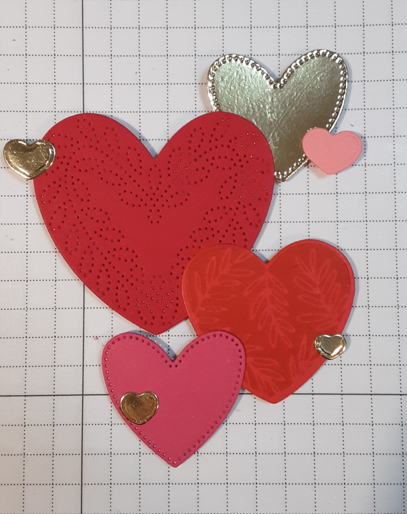 From Gold Foil sheets, I die cut the stitched heart from Hearts of Elegance and the cluster of four hearts from Sending Love dies. I also cut the stitched heart from Melon Mambo cardstock. From Real Red cardstock, I cut the elaborately stitched heart. I stamped the leafy heart image from Hearts of Elegance stamp set with Poppy Parade ink on Poppy Parade cardstock and cut it with the coordinating die. Lastly, I cut one of the two small hearts from Flirty Flamingo cardstock.