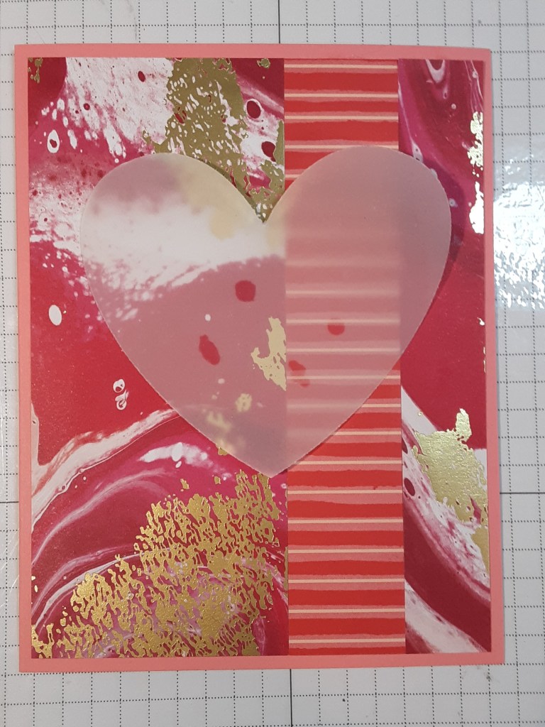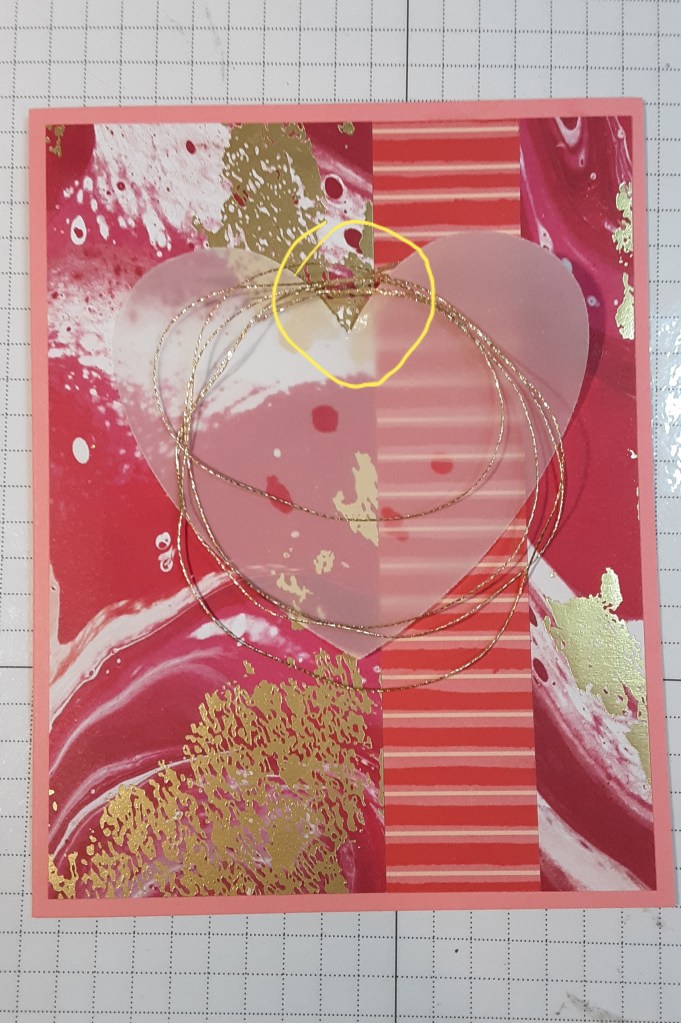 I placed a piece of clear packaging over the vellum heart and placed my hearts on it and worked with them until I was satisfied with the arrangement and carefully glued them together. I DID NOT glue them to the card! Here’s a tip: if you plan on making more than one card, I recommend placing a piece of clear plastic over the arrangement so you can use it as a template for your other cards without making a gluey mess of the original. I plan on sending one to each of my kids, so this is an easy way to make multiples.