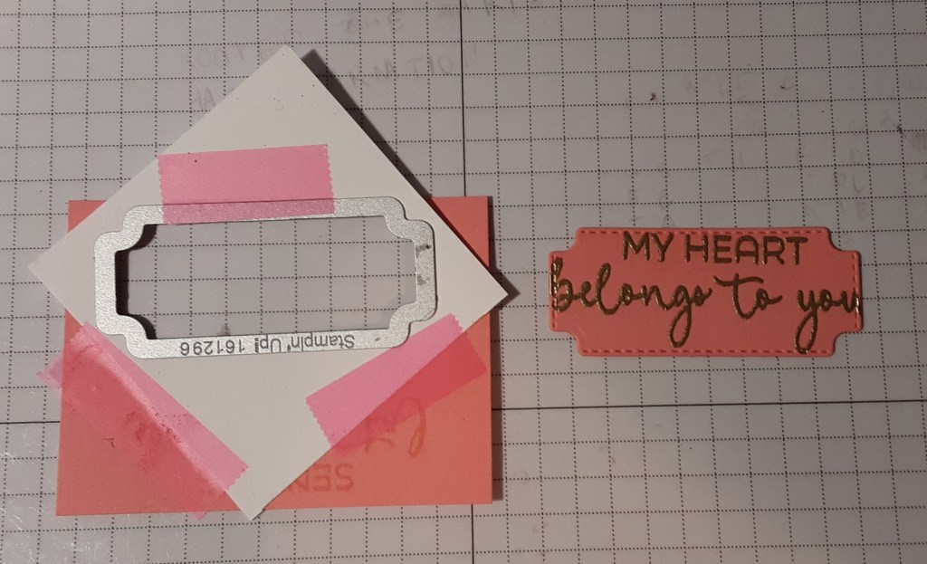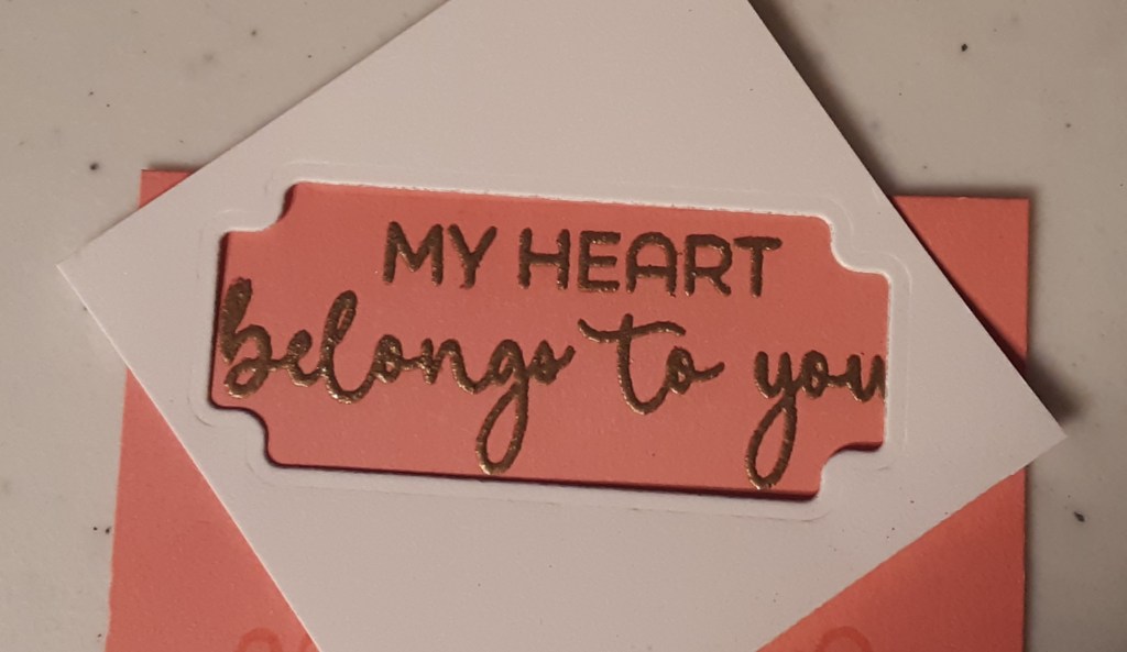 If you want to use the “My Heart Belongs to You” sentiment, it is a smidge longer than the “Sending Love” sentiment and is a little trickier to die cut. A solution to this problem is to make a template out of copy paper (you want it thin) and die cut the label from it. Leave a little space around it. You will use the window created from the die and lay it over the sentiment. Tape it down with scotch tape (not in the window). You can snug the die in the opening, tape it down so it doesn’t shift, and it will cut the sentiment out perfectly.