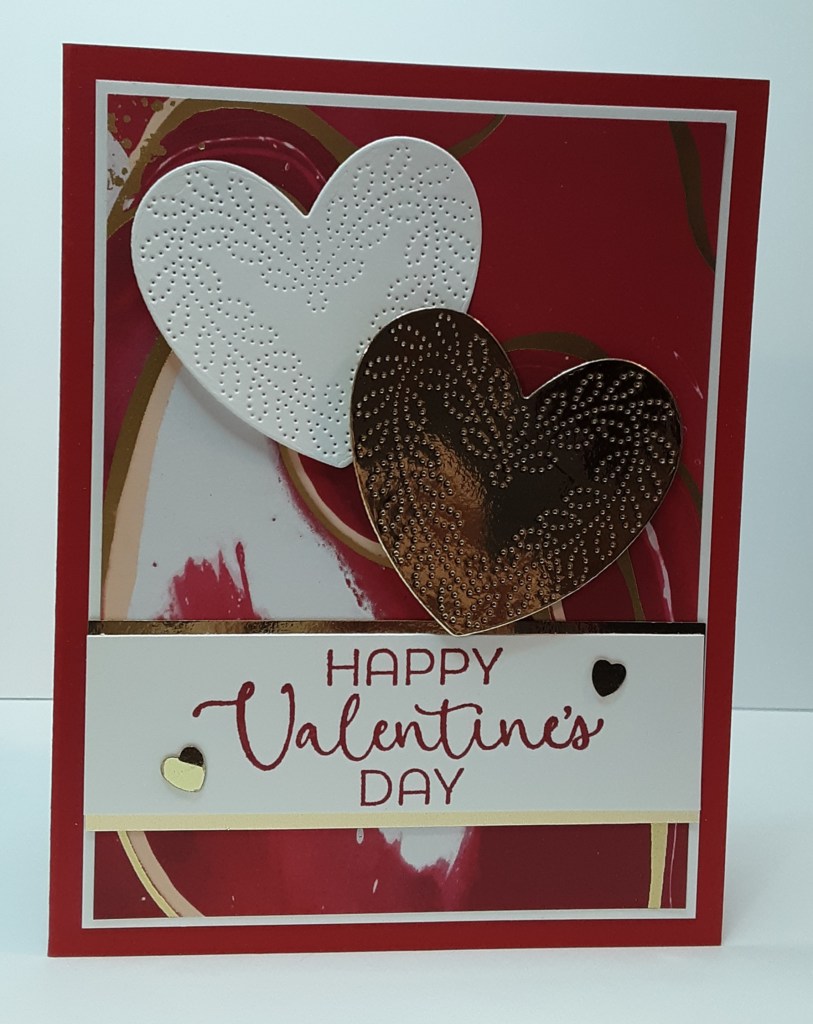 I cut a strip of Basic White cardstock to 3-7/8″ x 1-1/8″ and a piece of Gold Foil to 3-7/8″ x 1-1/4″. I stamped “Happy Valentine’s Day” from the Hearts of Elegance stamp set in Real Red ink on the white strip.