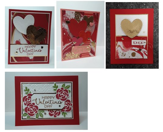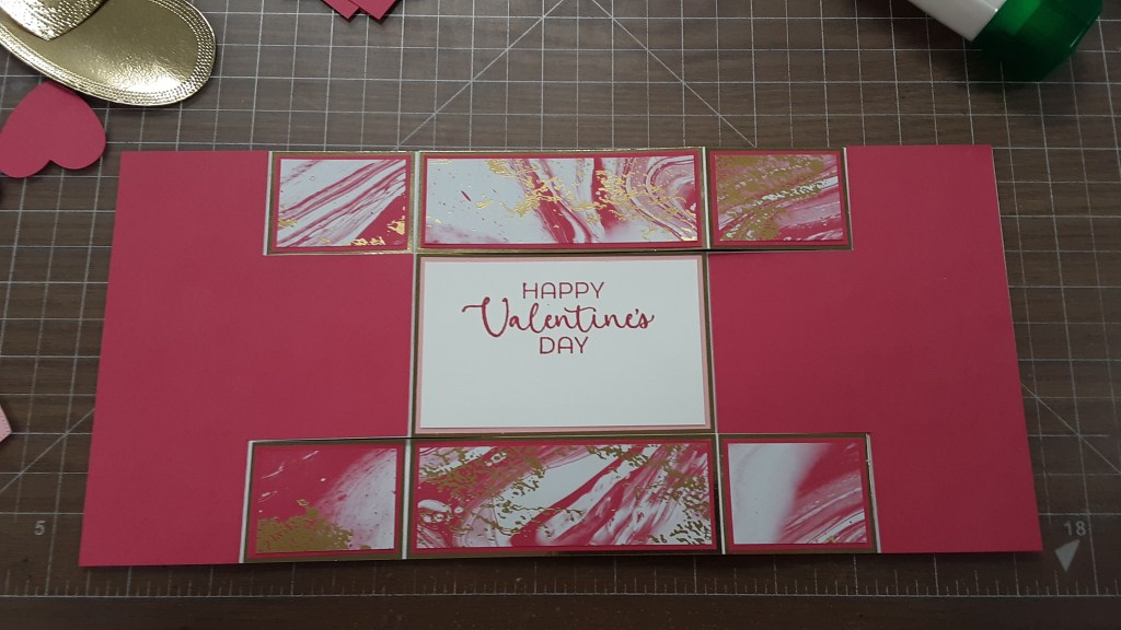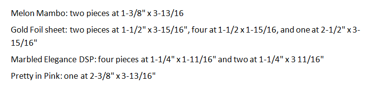 The various pieces will be glued in layers with the Gold Foil Sheet pieces as the bottom layer, the Melon Mambo cardstock as the middle layer, and the Marbled Elegance DSP on top. I used my favorite adhesive (Multipurpose Liquid Glue or Stampin’ Seal) to adhere my layers together. The layers will have narrow 1/16″ borders. The exception to the layering sequence is the center piece. For that I cut a piece of Basic White cardstock to 2-1/4″ x 3-11/16″. I stamped Happy Valentine’s Day from the Hearts of Elegance stamp set in Melon Mambo ink. (Get the bundle for 10% off.) This is glued to the Pretty in Pink cardstock piece. I laid out all my pieces before gluing them down.