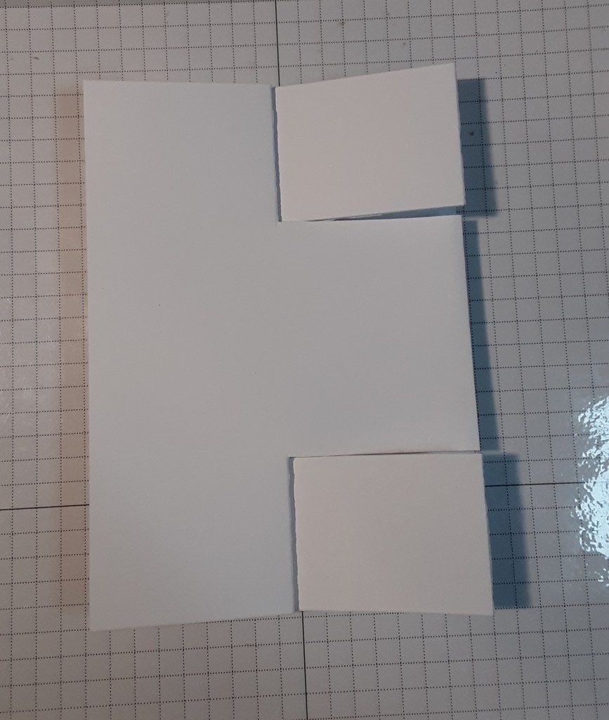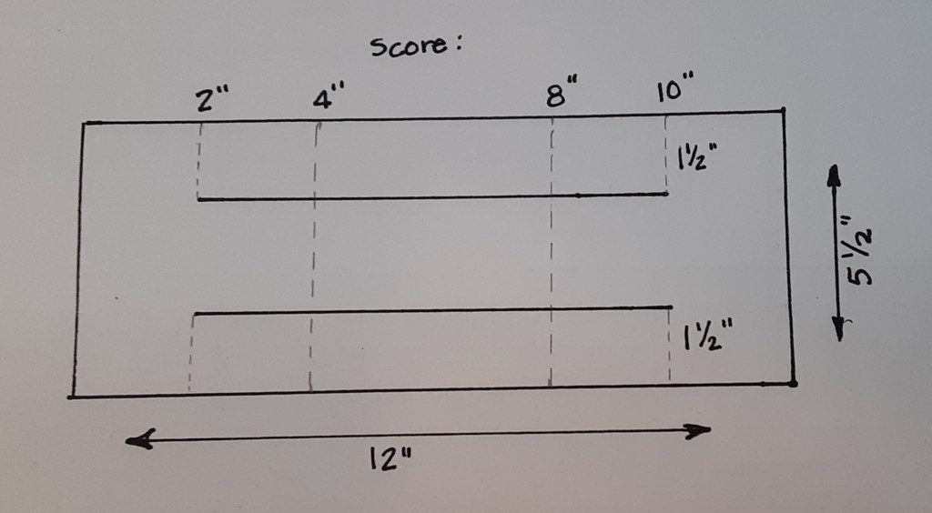 The card base begins with a piece of Basic White 12″ x 12″ cardstock, cut to 5-1/2″ x 12″ on my Paper Trimmer. For this card a paper trimmer with a drop-down blade is essential because we will be cutting and scoring in the middle of the piece. See below for a diagram of the cuts and scores. Solid lines are cut lines and the dotted lines are score lines.