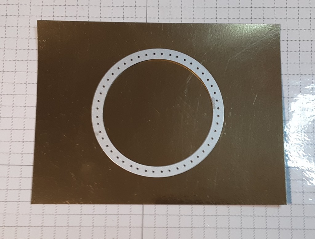 I adhered my Gold Foil piece to my card base using my favorite adhesive (Multipurpose Liquid Glue or Stampin’ Seal). Before I adhered the white embossed piece to the gold foil, I checked the sizing to make sure the borders were even. Sometimes the embossing folder changes the size a bit. I trimmed it so the borders were even and adhered it to the gold foil piece. It had a narrow 1/16″ border. I adhered the white circle to my gold circle. The decorative trim on the gold circle doesn’t really show up because of the narrowness of the border. If you would like a wider border, cut a smaller white circle.