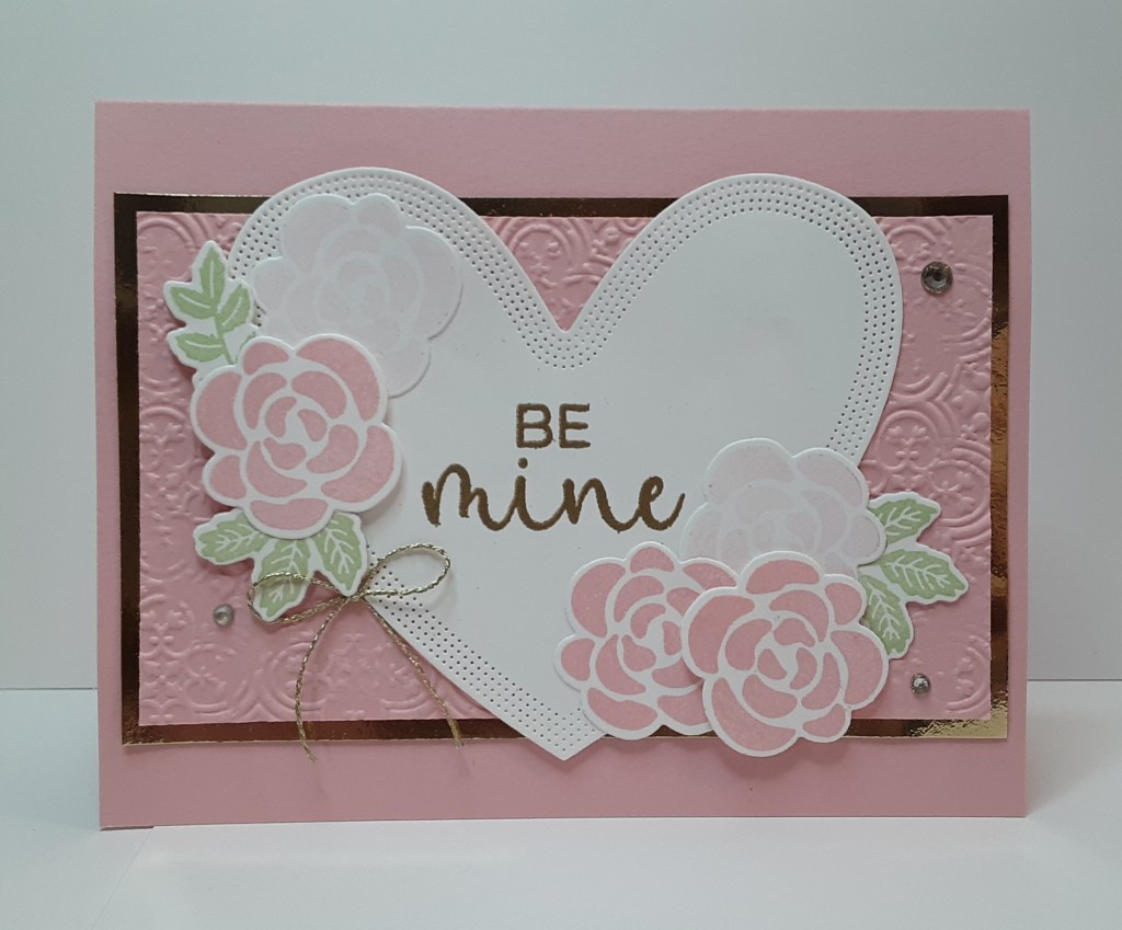 I adhered the dry embossed pink piece to the gold foil piece using my favorite adhesive (Multipurpose Liquid Glue or Stampin’ Seal). I adhered this to my card base. The top and bottom borders are about 1/2″ and the sides are 1/8.” I adhered the large heart to the center of the card. I glued three flowers directly to the heart and adhered the other two using Stampin’ Dimensionals. I tucked the leaves behind the flowers.