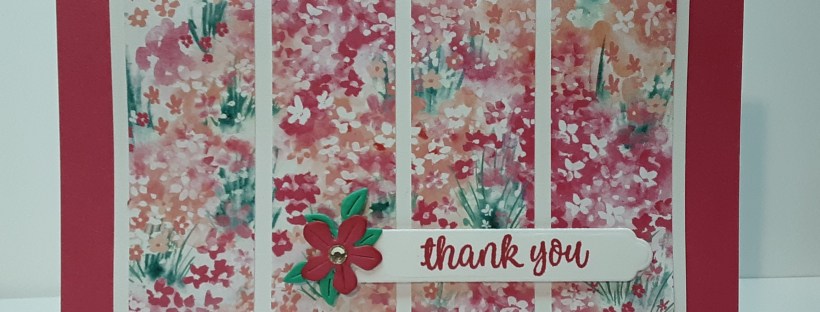 I stamped Thank You from the Heart Shaped bundle on a scrap of Basic White cardstock with Melon Mambo ink. I cut it out using the label die from Heart Shaped bundle on my Stampin’ Cut and Emboss Machine. I also cut the flower die from Melon Mambo cardstock and the leaf die from Shy Shamrock cardstock. These colors are featured in the DSP.