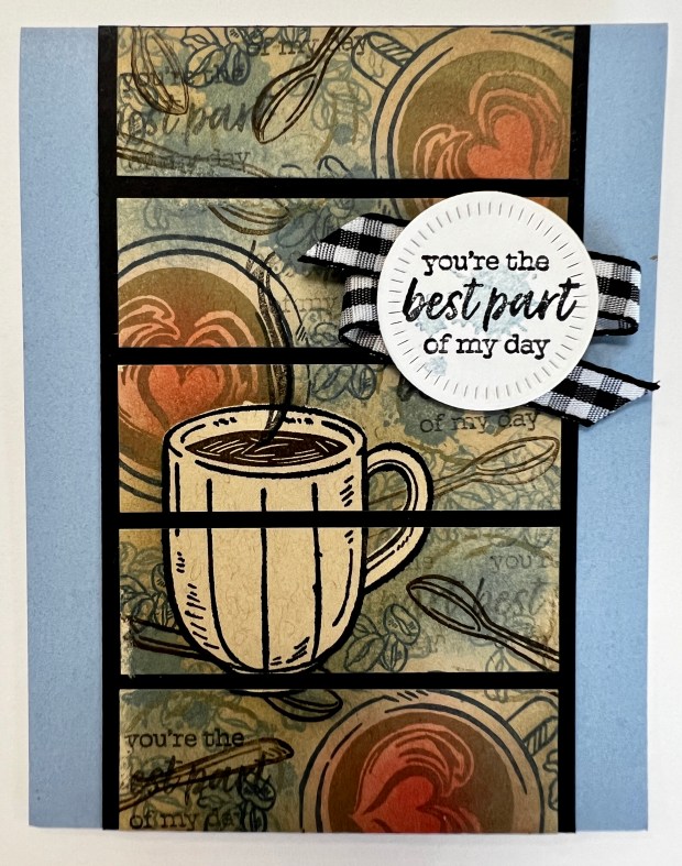 Once the panel was complete, I adhered it to my card base using my favorite adhesive (Multipurpose Liquid Glue or Stampin’ Seal). There will be a 1/2″ border, top and bottom.