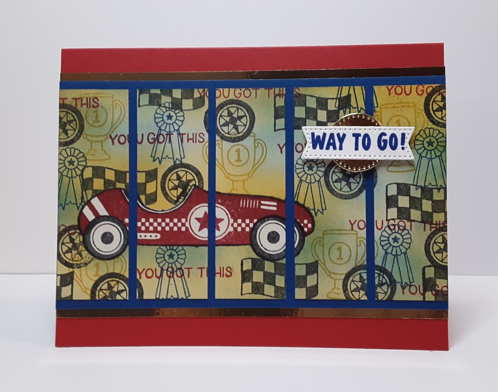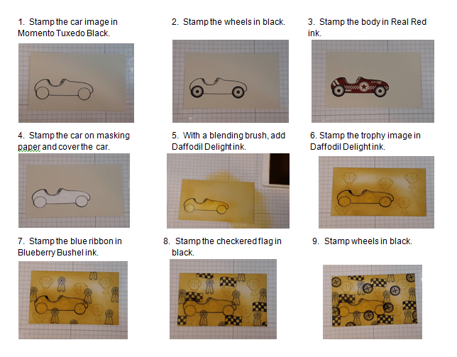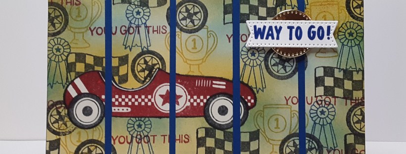 It feels like time is speeding by and this card taps into speed. As we speed through life, sometimes events around us become a bit of a blur. Let’s slow down a minute (or two!) and make this fun card. The Racing By stamp set has a wonderful mix of racing items that I thought it would make a great collage card. Marilyn here with this fun collage card. I thought the primary color palette against the Basic Beige background wasn’t too overwhelming. Hopefully the collage on this card isn’t just a blur and the race car is bright enough to stand out.
