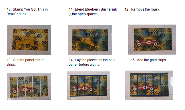 Now for the collage panel. Below are step by step instructions for creating the panel. You will need Momento Tuxedo Black ink, Daffodil Delight ink, Real Red ink, and Blueberry Bushel ink. You will also need Blending Brushes, Paper Snips, and Masking Paper. If you find the collage too busy, you can reduce the number of images you stamp.