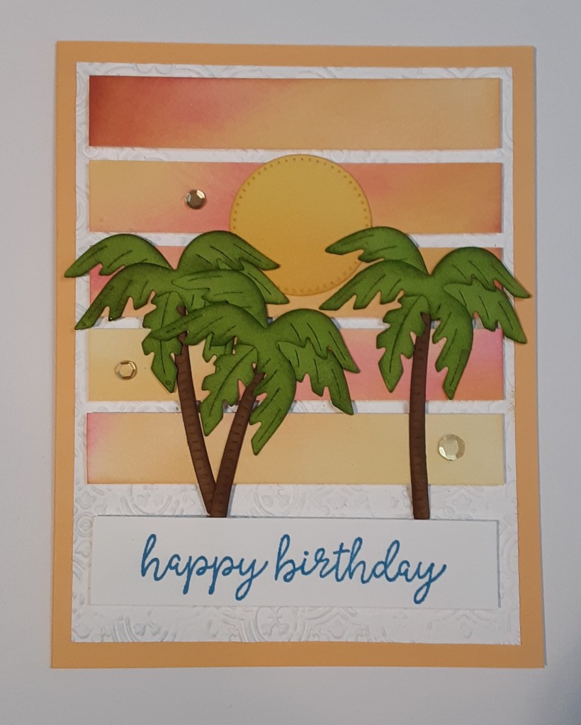 I added my ink blended sun with the Peach Pie toward the bottom. Next, I glued my palm trees together and added them to the card. The palm fronds are slightly different. In the picture, the top one goes in the back.