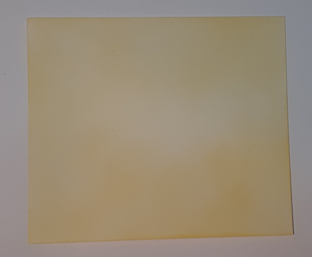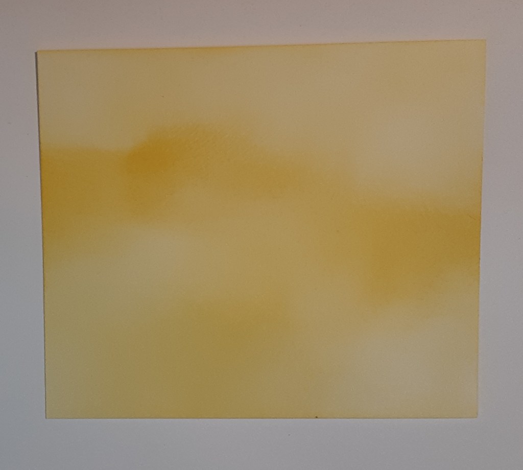 Next, I ink blended the 3-5/8″ x 3-1/8″ piece. You could also use five 3-5/8″ x 5/8″ strips instead, if you want to get rid of some of your strip scraps. I blended on some Lemon Lolly ink with my Blending Brush. I was a little random, not covering the whole piece and varying my pressure and intensity. If you are using strips, just randomly add the ink. Before applying the ink to the cardstock, I did tap off some excess so it wouldn’t blob on the card. (In all honesty, I forgot to tap it off on my first effort and got a blob and had to conceal the blob under another ink color. The photo below is not my first attempt.)